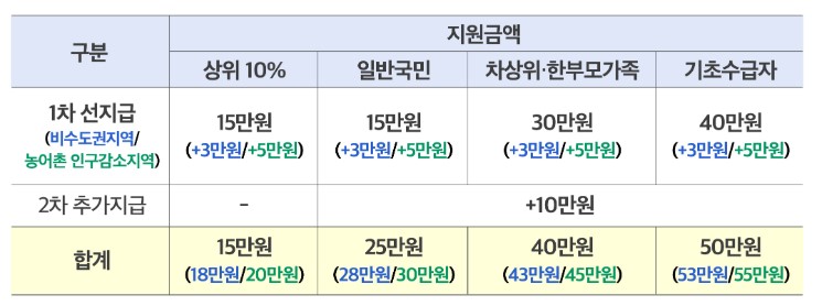 1차 기본 지급액은 1인당 15만원입니다. 여기에 비수도권 지역(서울, 인천·경기, 농어촌감소지역 제외) 1인당 3만원 추가 지원하고 농어촌 인구감소지역(84개 시군)은 1인당 5만원 추가 지원이 있습니다. 소득에 따라 2차 추가지급 10만원이 더 있어 총 최소 15만원에서 최대 55만원까지 지원받을 수 있습니다.