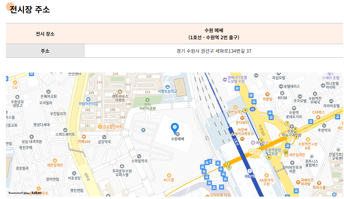 자차로 오실경우 내비게이션에 수원메쎄를 입력하셔도 되시고 혹시 안 될 경우 '경기 수원시 권선구 세화로134번길 37'