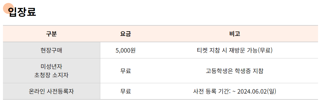 입장료는 1인당 5천원이고 4일 동안 재입장 가능합니다. 미성년자와 초청장 소지자, 온라인 사전 등록자는 무료 입장할 수 있습니다. 미성년자 중 고등학생은 학생증 지참해야 입장가능합니다.