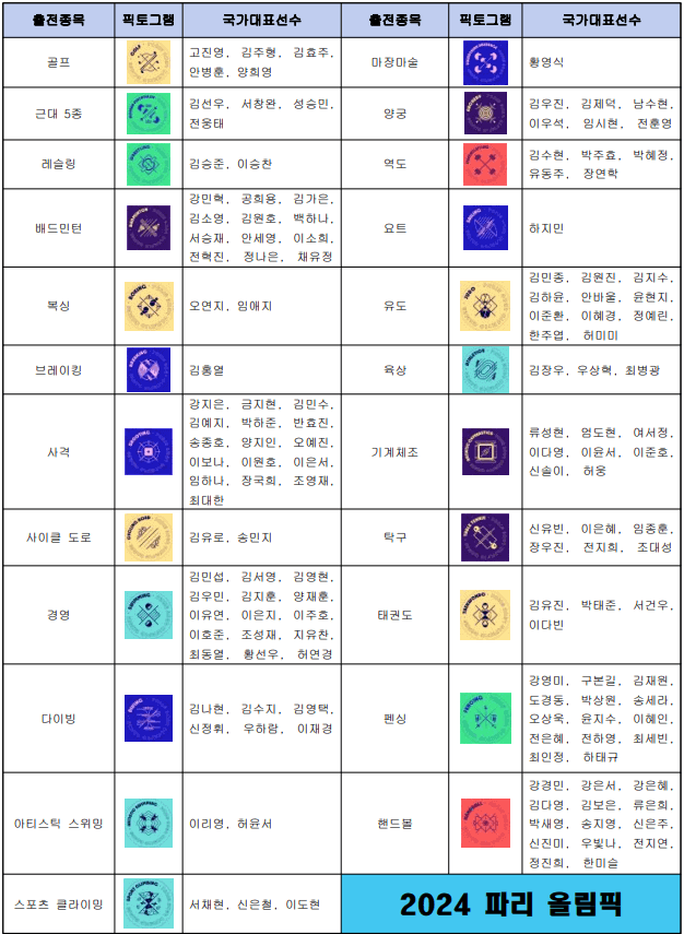 2024 파리올림픽 우리나라 출전종목과 국가대표선수